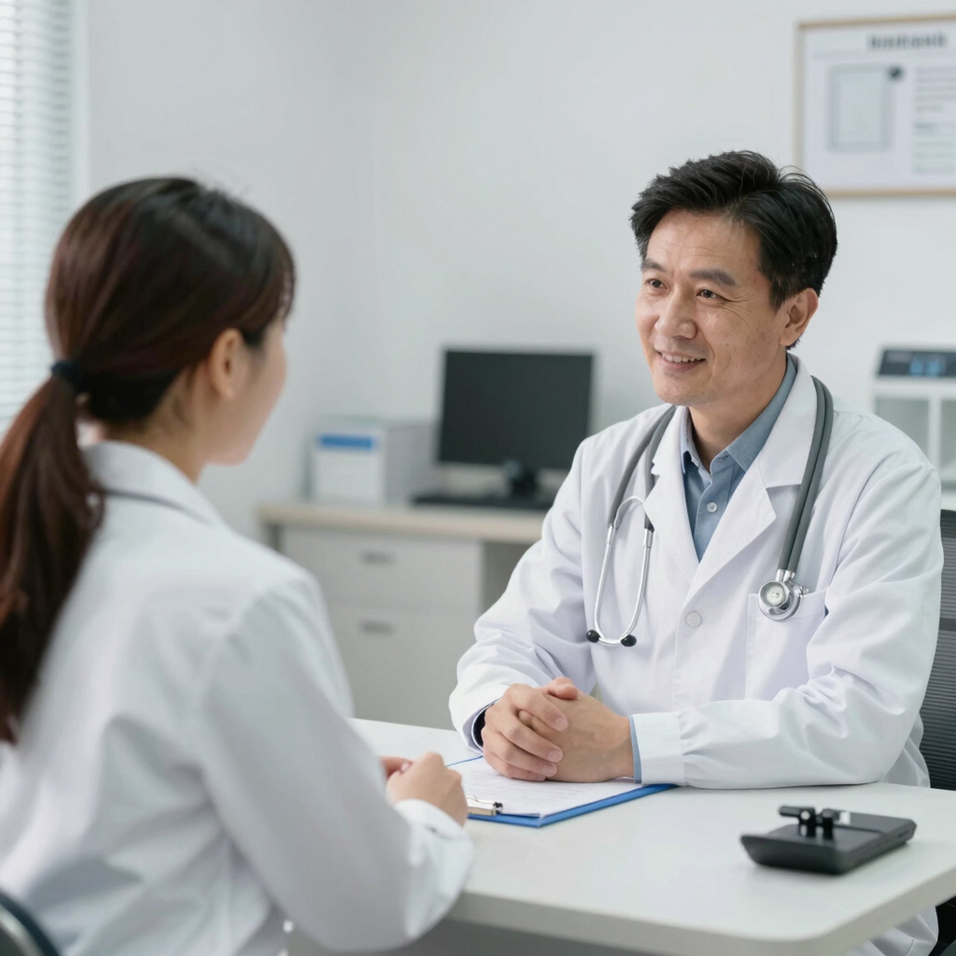 A friendly healthcare consultant discussing medical expense coverage options with a client in a bright office.